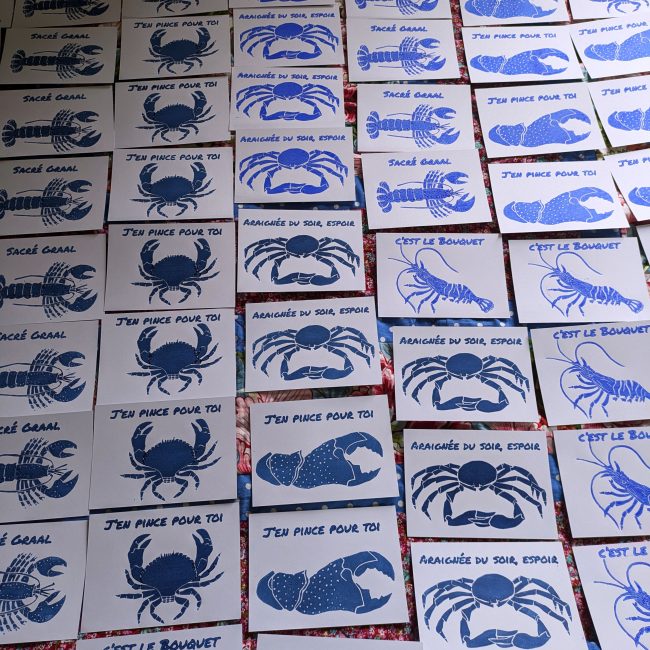 Poissons et crustacés gravés.