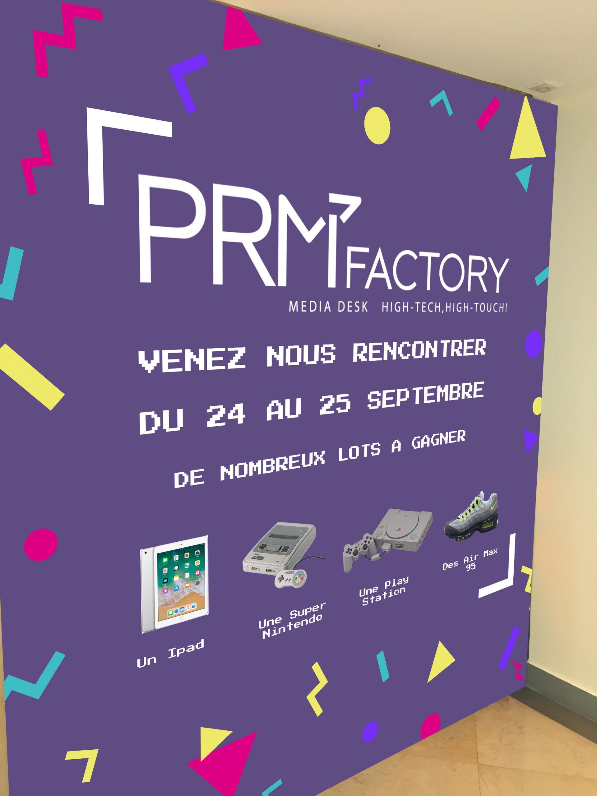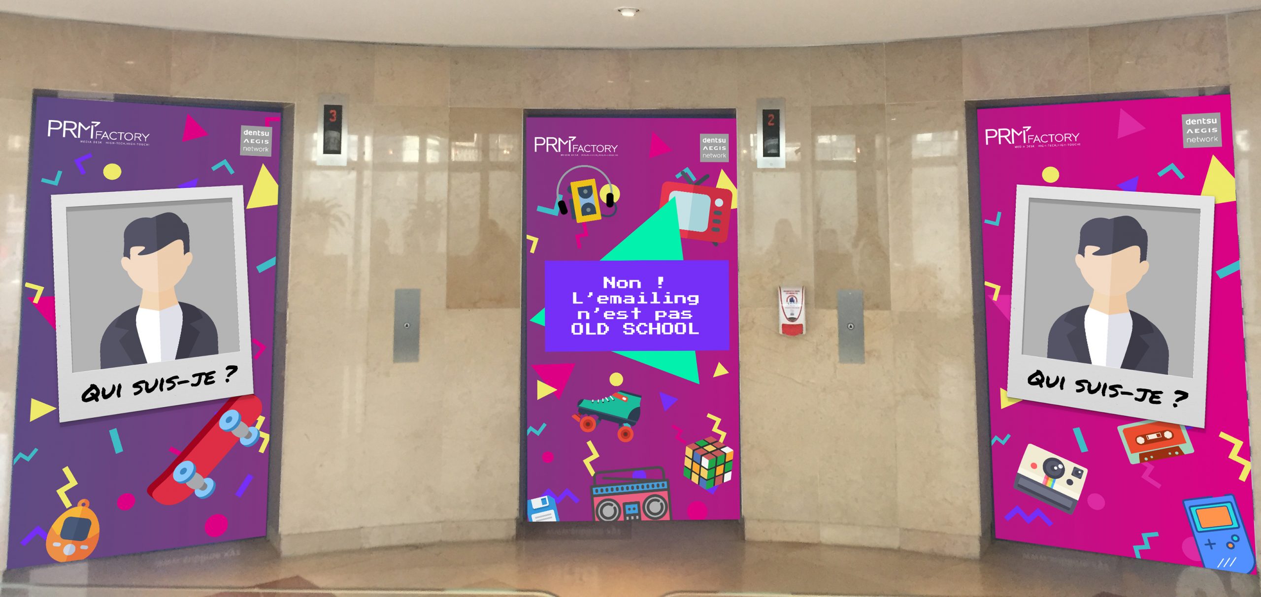 Habillage d'ascenseurs et d'un mur sur le thème des années 90. Création d'un site internet de participation à un jeu concours. Réalisation des maquettes, impression, intégration (HTML5, CSS3).