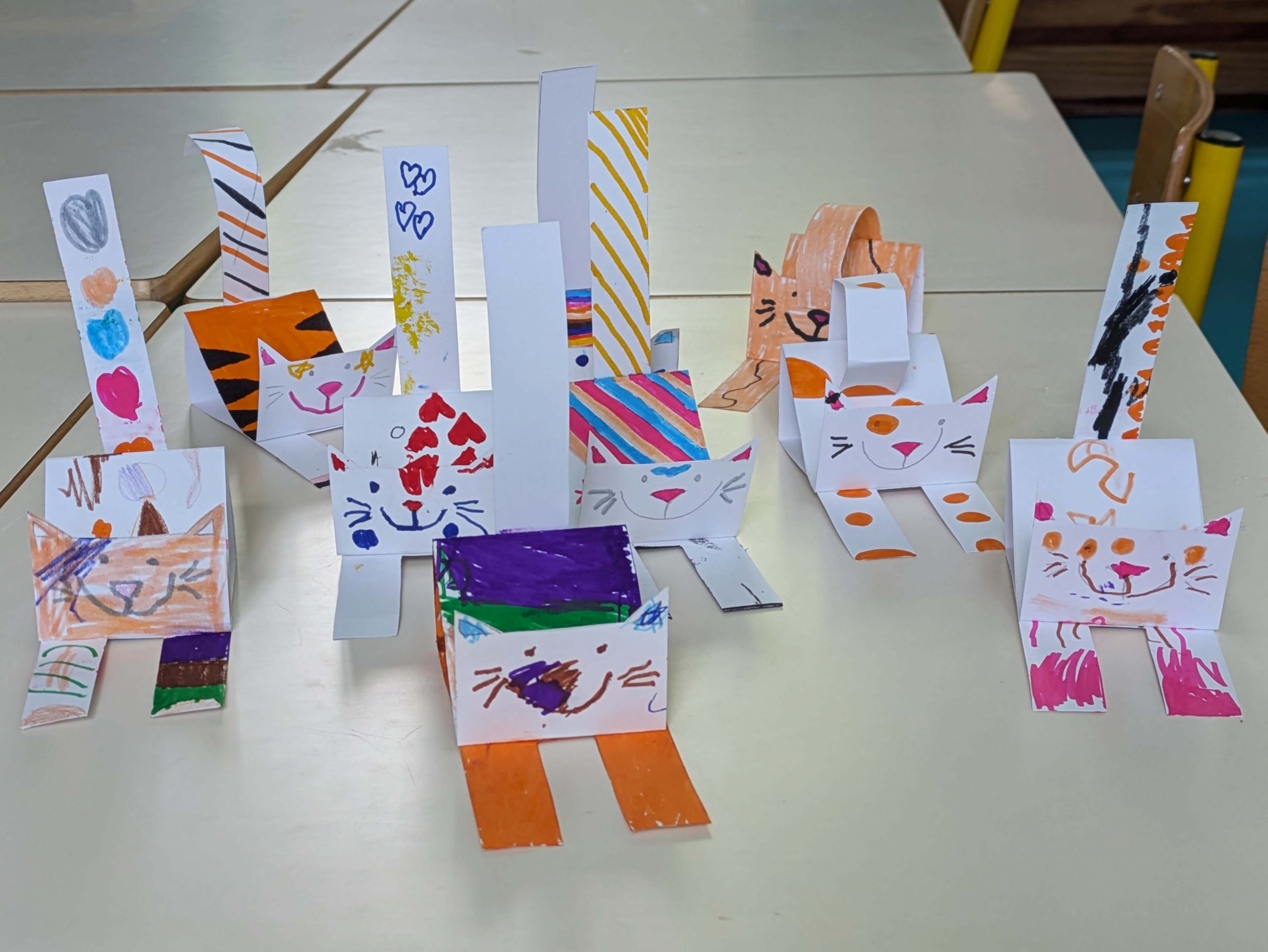 Décoration et assemblage de chats en papier.