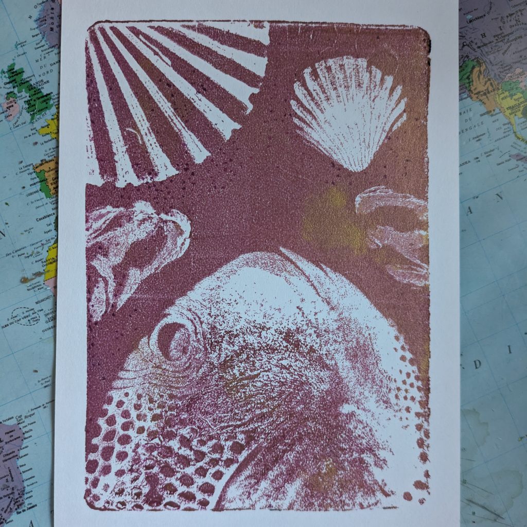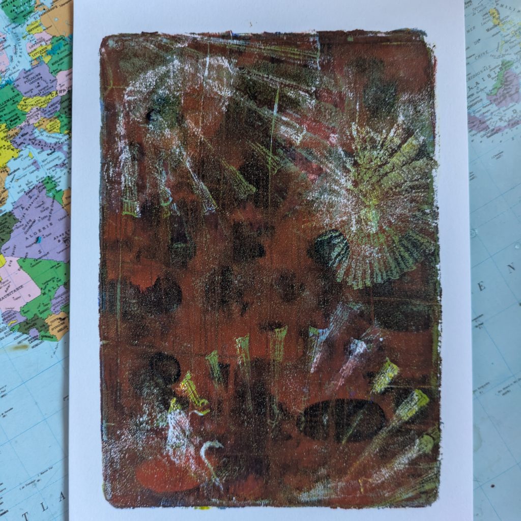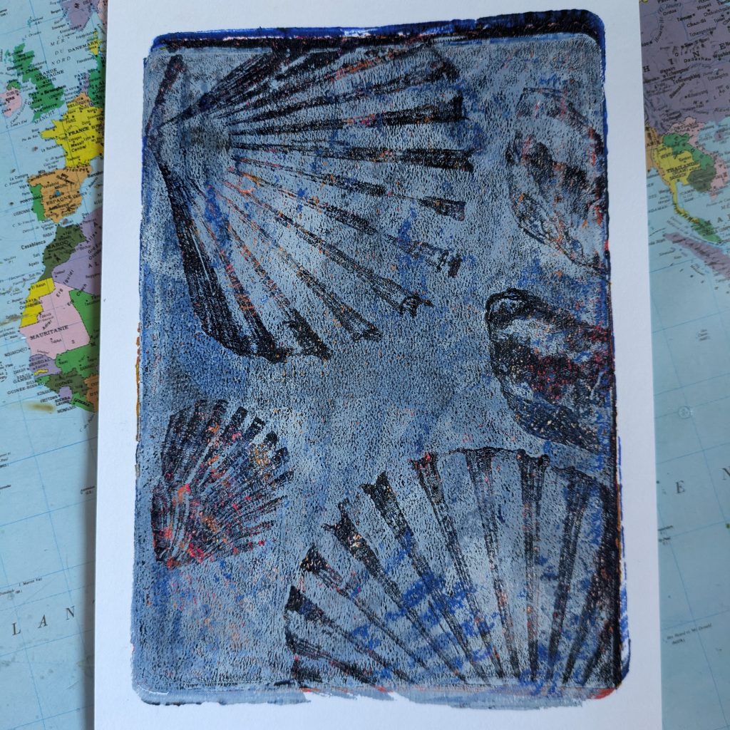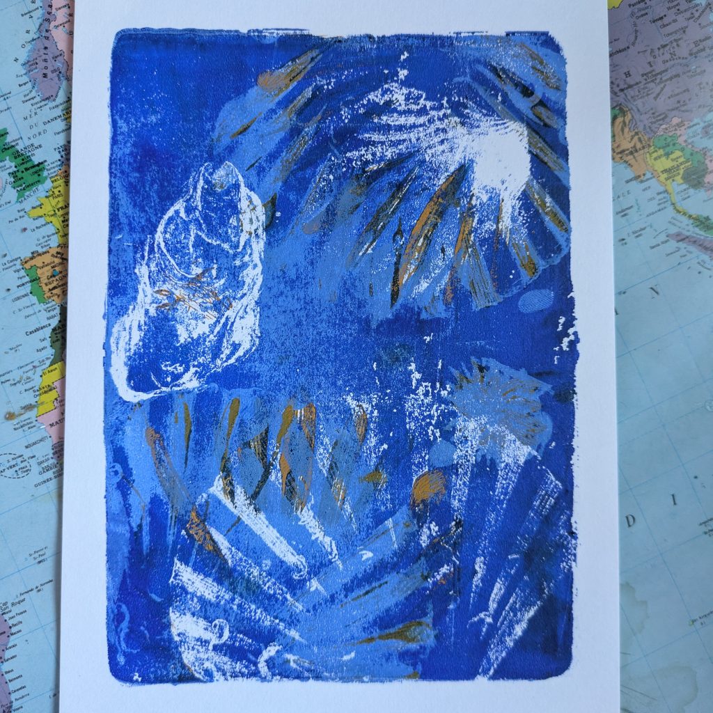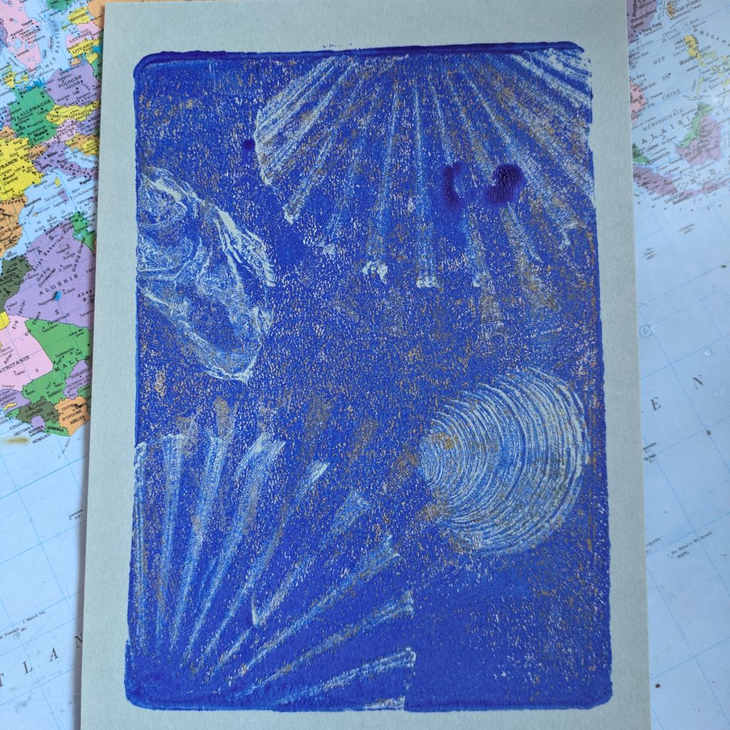 Impressions à l'aide d'une Gelli Plate (plaque souple utilisable à l'infini permettant la création de monotypes).